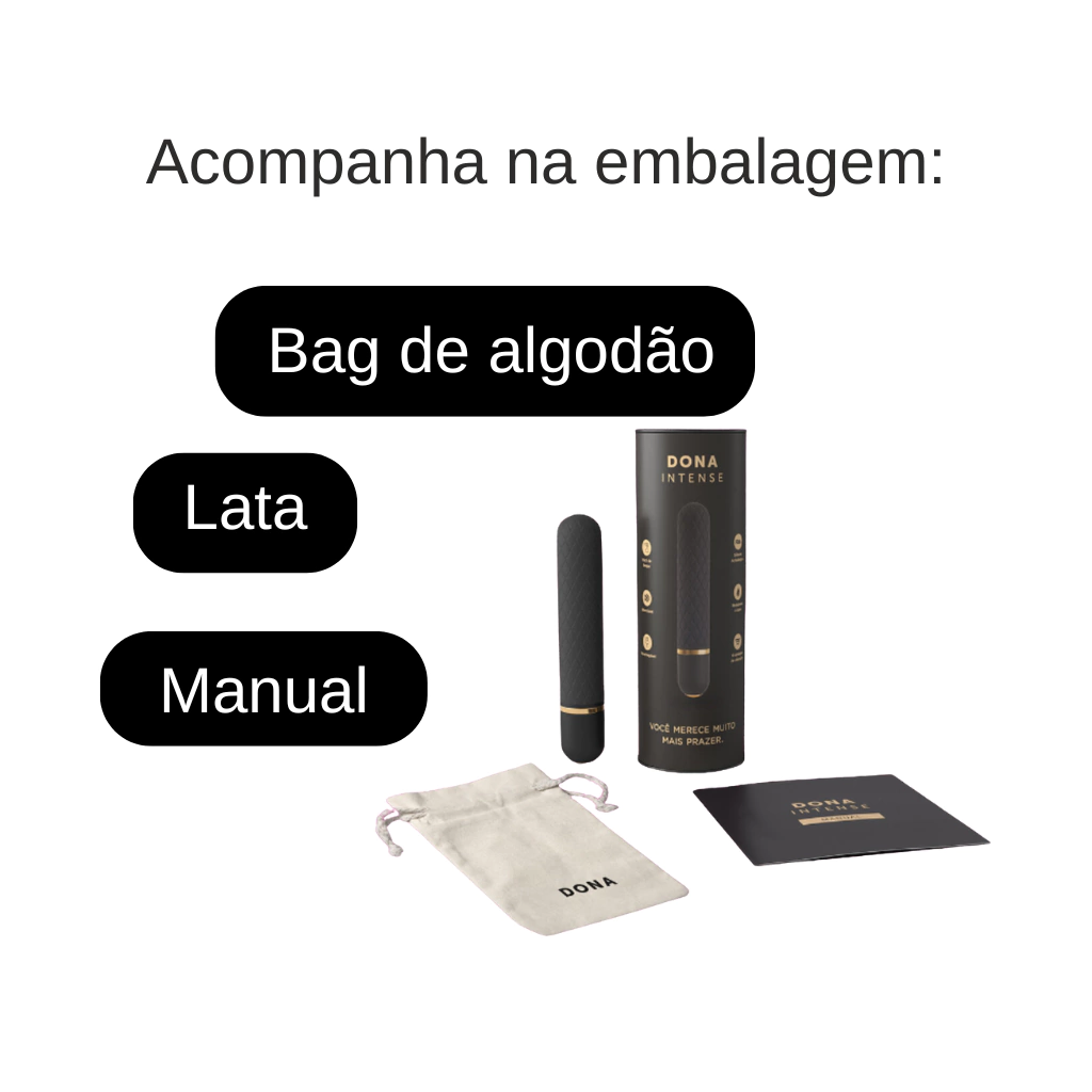 A embalagem é extremamente bonita e chamativa. Dona Intense vem dentro de uma linda bolsa de algodão, perfeita para guardar o seu vibrador. E para finalizar com requinte e bom gosto, acompanha uma lata personalizada com manual ilustrado, para que você possa usufruir do produto com segurança e conforto.